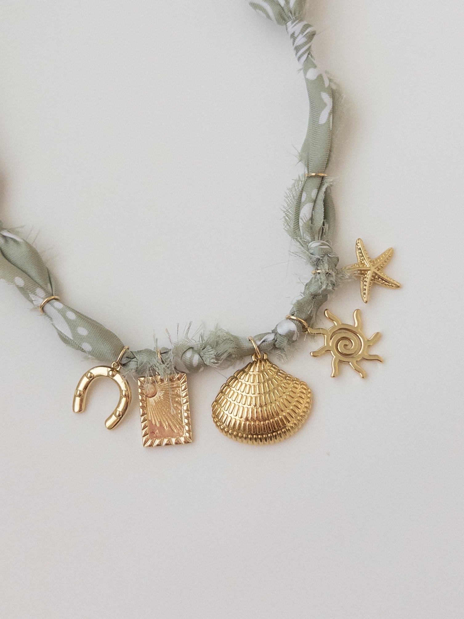18k gold filled. 24” long. Tie back. Silk material. If you want the charm order changed or small revisions, please leave a note in the comment box.