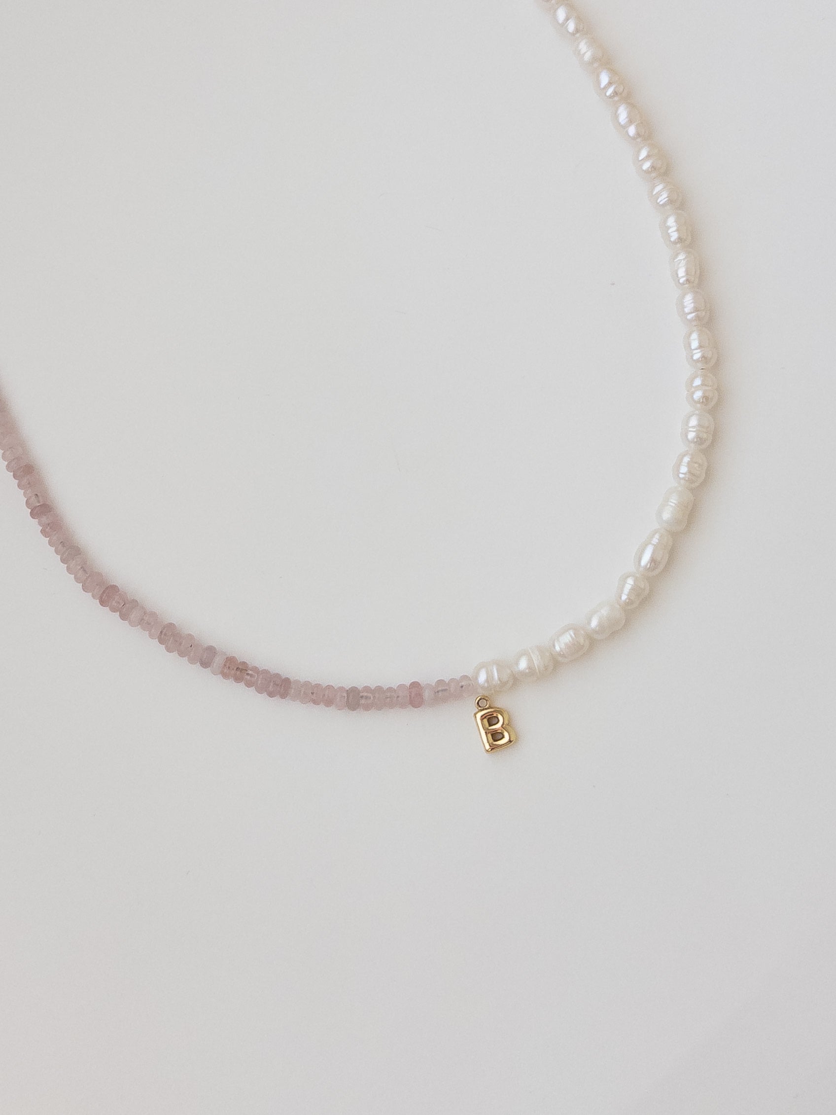 Pink quartz and freshwater pearl necklace. 18k gold filled letter charm. Handmade.