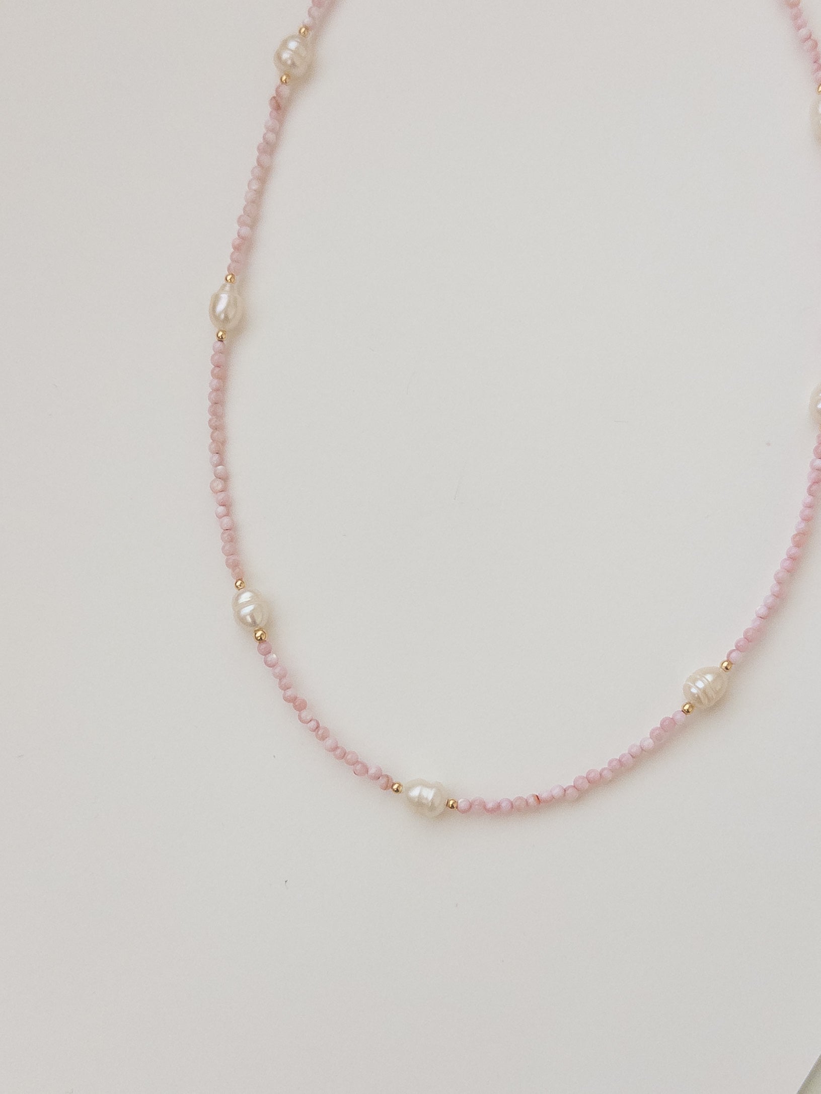 2mm pink shell beads and freshwater pearl accents. Handmade.